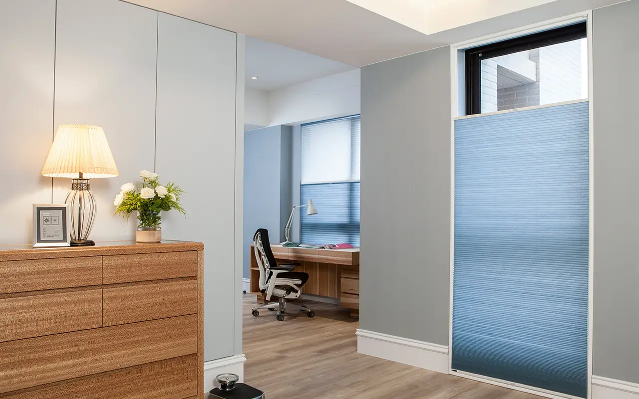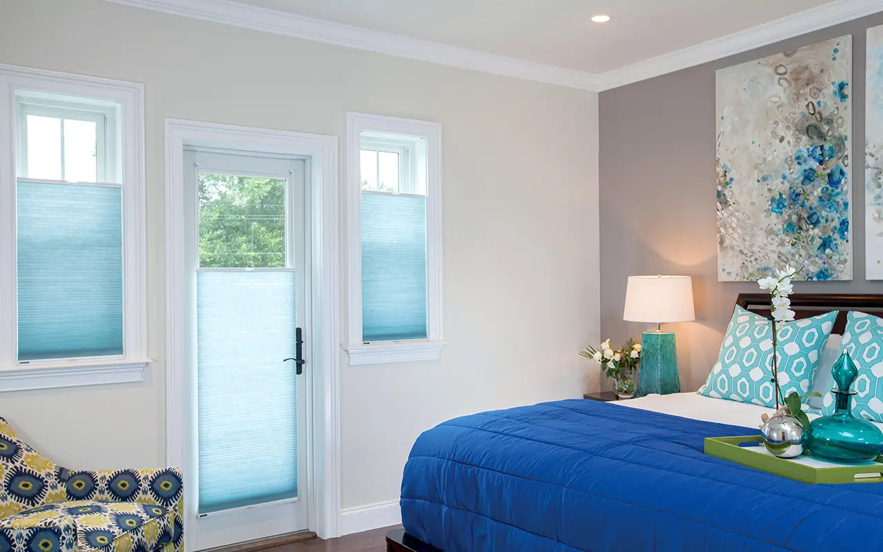 Cellular shades are versatile enough to enhance nearly every room in the home. In bedrooms, blackout fabrics create a restful environment by blocking unwanted light, while in living rooms they can be layered with drapes to add softness and elegance. Moisture-resistant fabrics make them a practical choice for bathrooms, and in home theaters they provide superior light control along with sound absorption for the perfect viewing experience. Bay windows can be custom-shaped for a seamless fit, and sliding glass doors benefit from vertical cellular panels that glide smoothly from side to side. During your free in-home consultation, we’ll help you select the best fabrics and configurations to match both your style and functional needs.