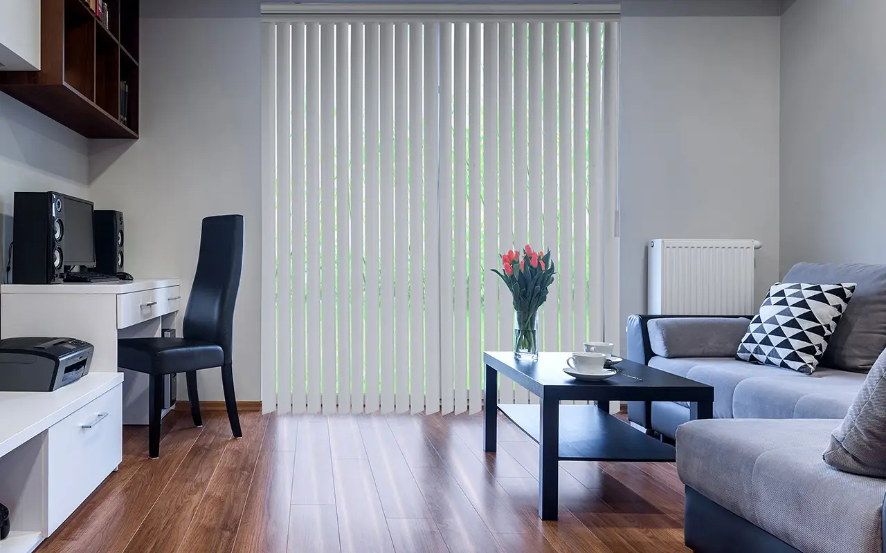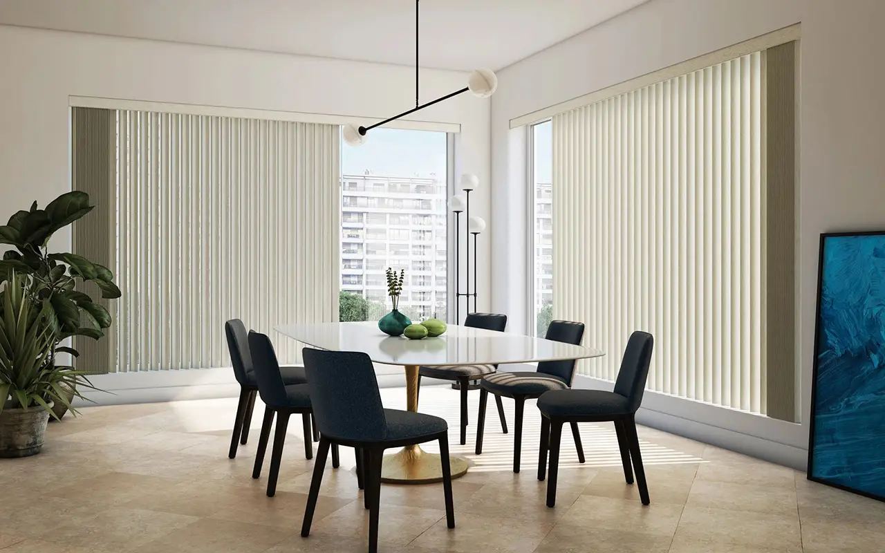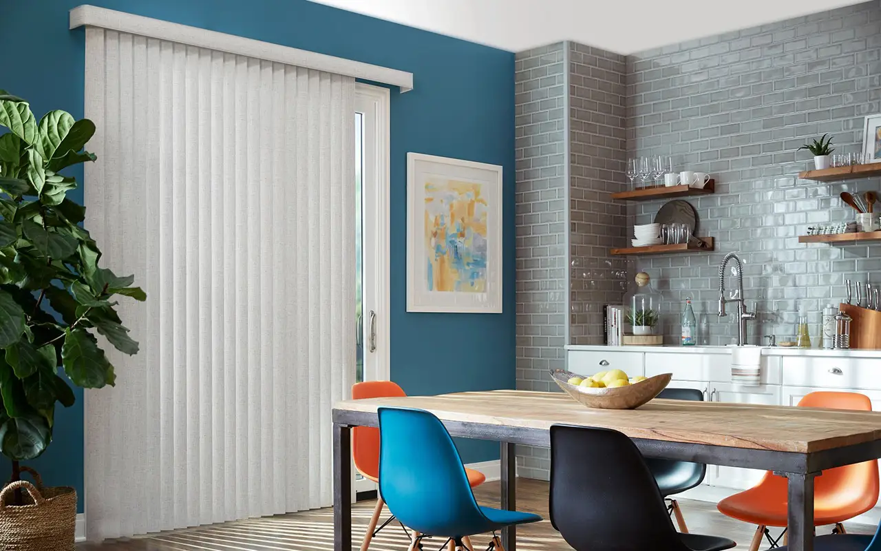 Vertical blinds are built with performance in mind, making them one of the most practical window treatments for busy homes and high-traffic areas. Most materials are designed to resist dust, moisture, and UV damage, so they maintain their appearance with minimal effort. Vinyl and composite vanes can be quickly wiped down with a damp cloth, while fabric vanes can be vacuumed or lightly spot-cleaned depending on the weave, keeping them fresh and functional for years.