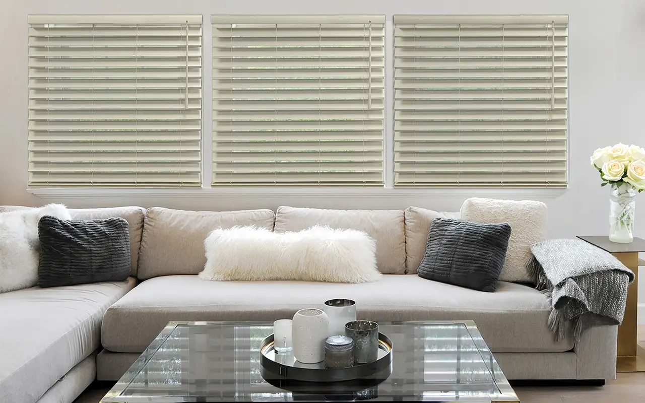 Faux wood blinds are made from durable composite materials such as vinyl, PVC, or polymer blends, engineered to mimic the natural look of wood while resisting moisture, warping, and fading. With realistic woodgrain textures, a wide variety of finishes, and reinforced slats, they offer the beauty of wood with added strength and low maintenance.