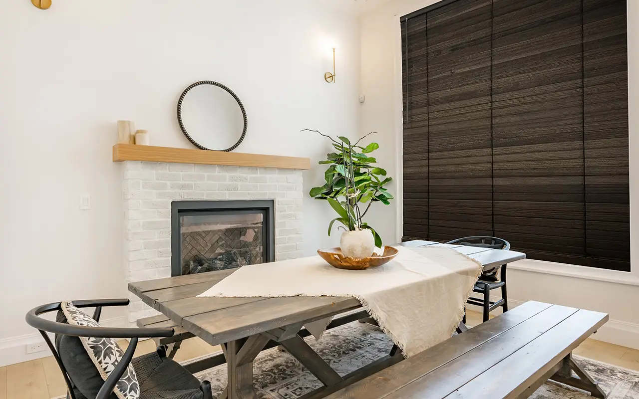 Wood and faux wood blinds can be customized with thoughtful details that complete the look of your windows. Matching valances provide a built-in finish that seamlessly covers the headrail, while decorative cloth tapes, tassels, and ladders add character and a touch of personality. For wide openings such as sliding doors or storefront windows, side-by-side headrails ensure smooth operation and consistent coverage. You can also choose between inside or outside mounts, allowing the blinds to be tailored precisely to your trim and reveal depth for a clean, professional fit.